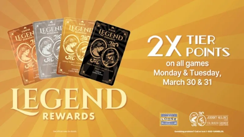 Legend Rewards 2X Tier Points 2X TIER POINTS ON ALL GAMES, ALL DAY! Monday, March 30 + Add to Google Calendar + iCal / Outlook export 00 days 00 hours 00 minutes 00 seconds Date Mar 30 - 31 2026 Time All Day Share this event
